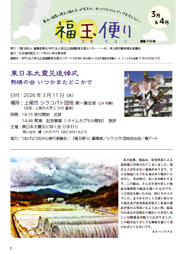 埼玉県内に避難している人々が、避難元地域の状況や帰還・移住の選択を問わず、生活を再建し安心して暮らせる社会を目指しています。